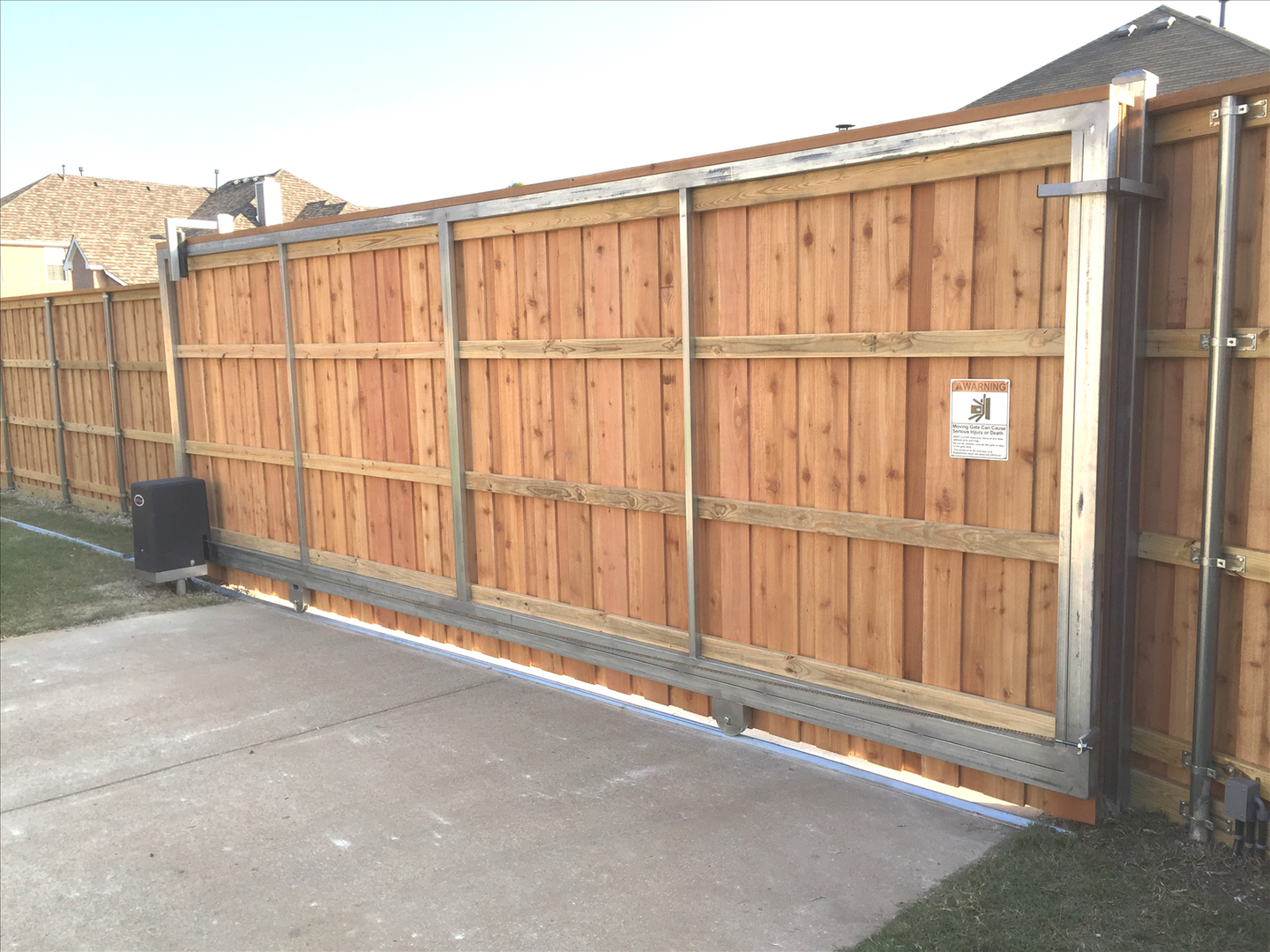 The second photo above shows that we can install a wireless keypad which is code programmable. Once again, we try to install it in a shady area when possible to prolong the life of the unit and the battery. It’s made to tolerate the sun and weather, but we all know it’s going to last longer in the shade. We also take the time to install the safety sign that comes with each unit. Others don’t…..