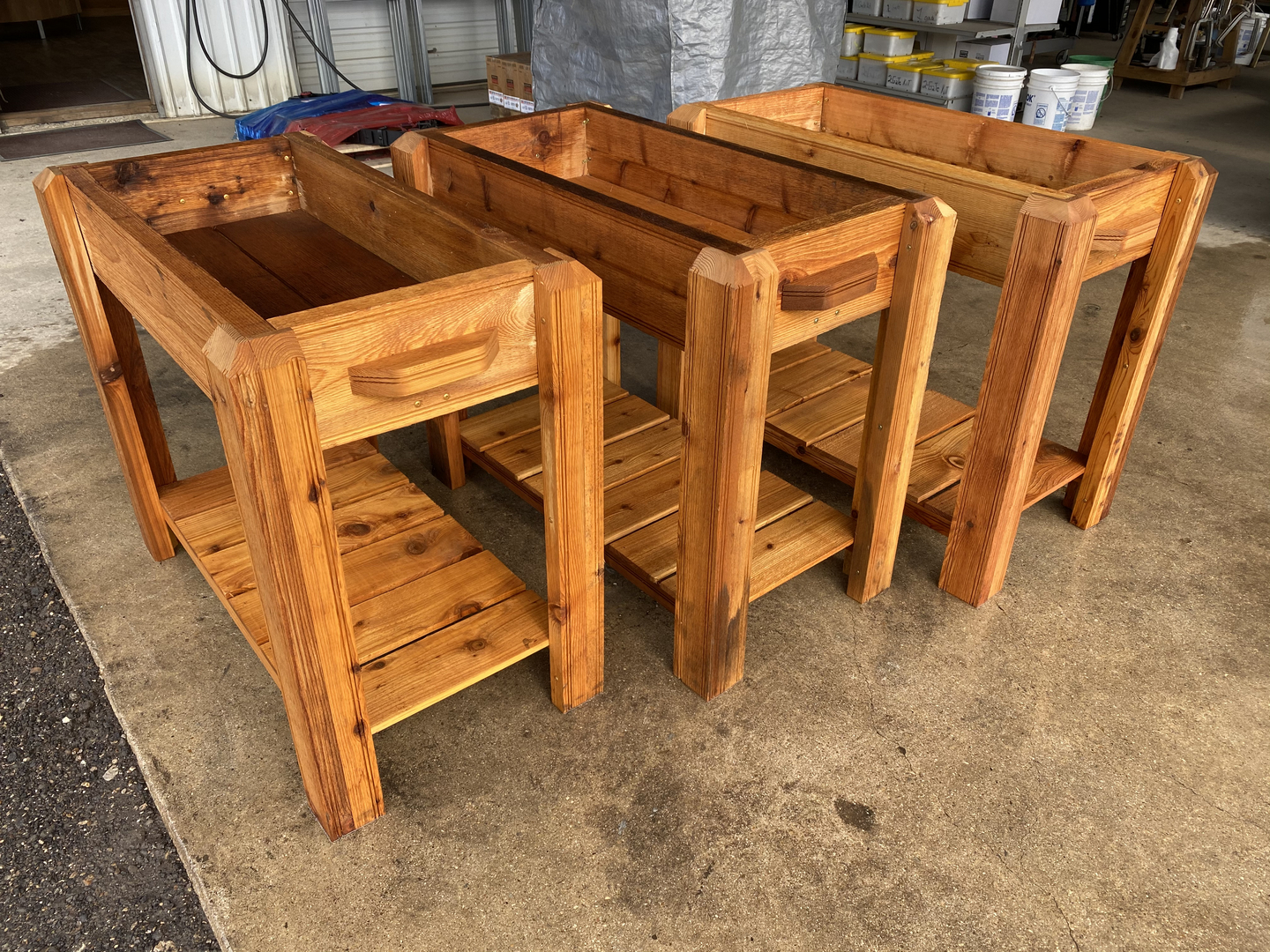 Our units are made from 1-3/4 inch thick Western Red Cedar and are very heavy duty. Our new model has a lower shelf for storage of pots, potting soil or whatever you need. The planters can be painted, stained of left natural to turn a nice grey weathered wood color. All lumber is fastened with our famous washer head screws for maximum durability. Ornamental Aluminum Art (as seen in some of the photos) can be added for an extra charge.